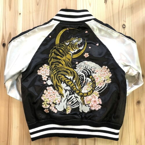 今回は【波】【月】【桜】のかっこよさ溢れるデザインでございます! 数少ないキッズのスカジャンなので、このスカジャンを選ばない理由が見つかりません! 素材は表面に光沢感のあるポリエステルサテン生地、裏面、ポリエステル100%の生地を使用しています。