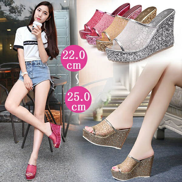 ジェリー サンダル つっかけ レディース ウェッジソール ハイヒール クリア キラキラ ラメ メッシュ オープントゥ ポインテッドトゥ 痛くない 柔らかい 通気性 夏 厚底 おしゃれ ピンク ゴールド 紺