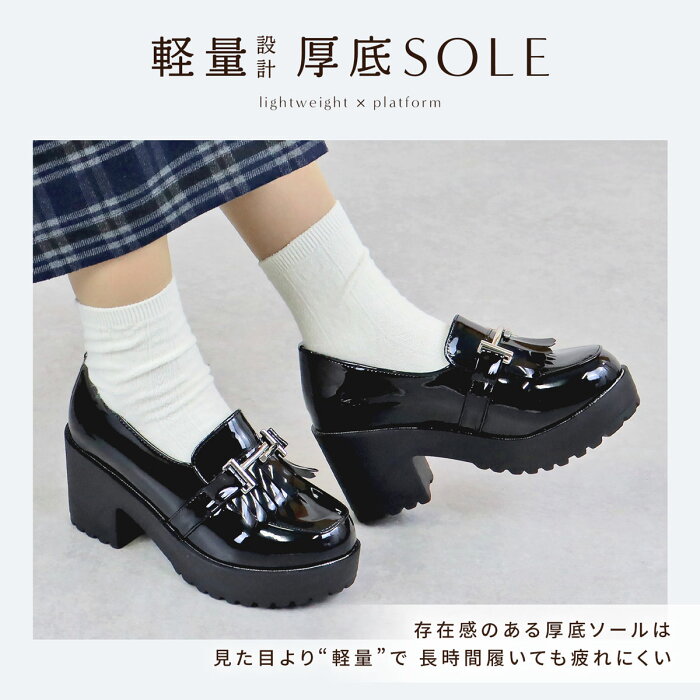 ローファー レディース 厚底 ビット コイン おじ靴 タッセル フリンジ エナメル 合成皮革 マニッシュ 7.5cmヒール No.3022 22.5cm〜24.5cm 黒 ブラック LiBERTYDOLL リバティードール